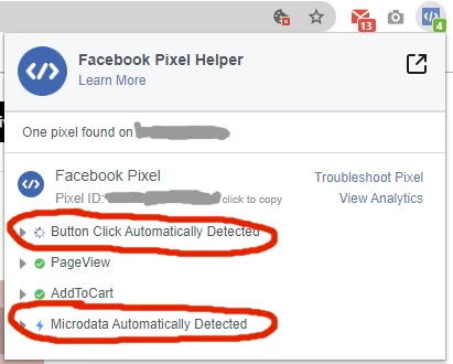 Det kan ses ved at bruge browser plugin "Facebook Pixel Helper". Her ses en webshop hvor der måles 2 "korrekte" Pixel hændelser, en mikrodata registrering og en mangelfuld hændelse. De to hændelser som er markeret med rødt er initieret af Facebooks automatiske registrering, og den første indikerer, at data i forespørgslen er mangelfuldt.