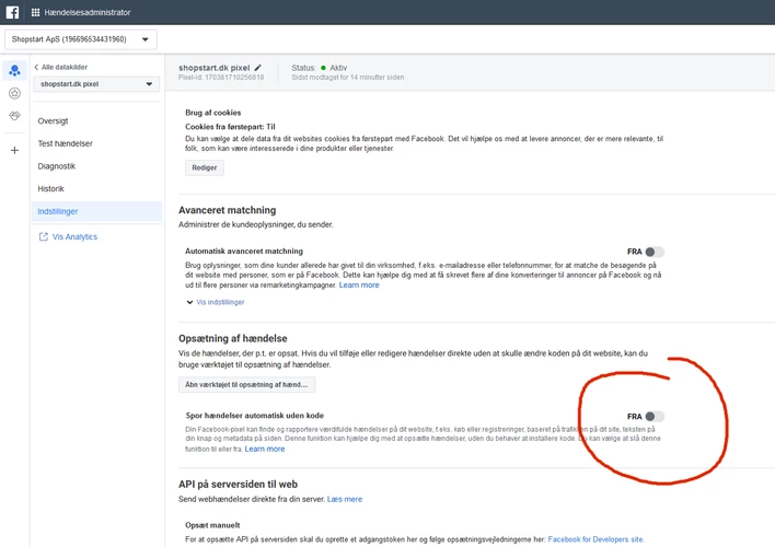 Når man har aktiveret dette, så sørger platformen for at sende de hændelser som giver mening til Facebook.
