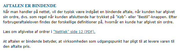 Rzecznik Konsumentów uważa, że do zawarcia umowy dochodzi w momencie naciśnięcia przycisku "Kupuję" lub "Zamawiam". Zobacz więcej: forbrugerombudsmanden.dk/.../under-salget/