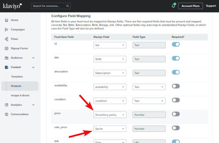 Klaviyo understøtter ikke flere prisfelter såsom tilbuds priser. Ønsker du at gemme dine tilbudspriser som varepris hos Klaviyo, så kan du gøre det ved at "mappe" feltet 'sale_price' til 'price'. Det kræver samtidig at du mapper feltet 'price' til noget andet, for eksempel 'inventory_policy'.