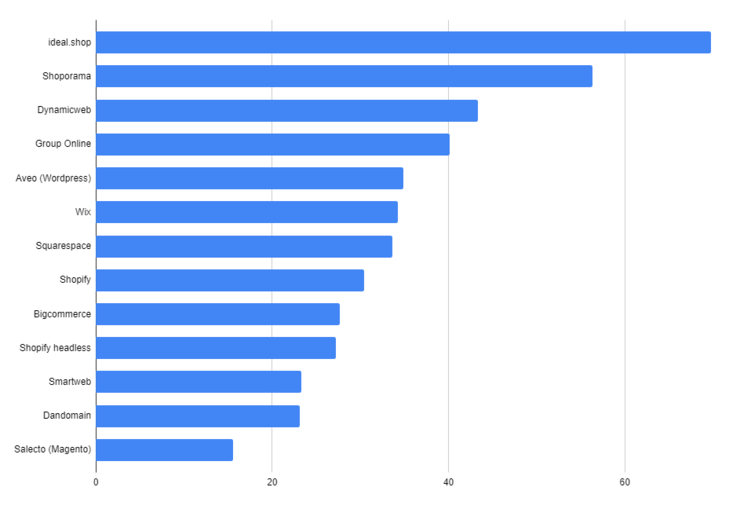 Der Test wurde am 3. April 2022 über pagespeed.web.dev durchgeführt. Aktualisiert am 14. März 2023, als Shopify Headless hinzugefügt wurde . Wenn Sie alle Daten sehen möchten, die die Grundlage für das Diagramm bilden, schreiben Sie uns - wir senden Ihnen die Tabelle und Screenshots.
